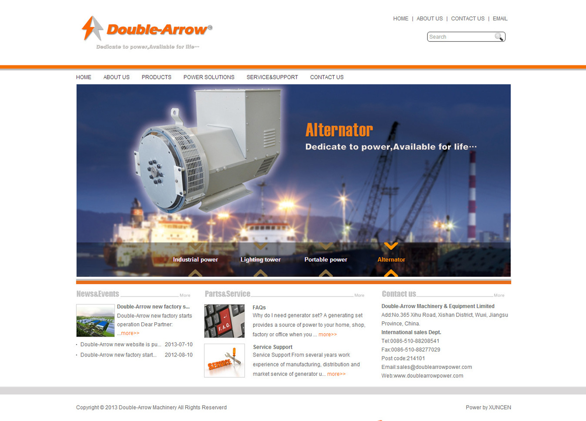 訪問網(wǎng)站DOUBLE-ARROW is located in Wuxi, which is the flourishing area of the world manufacturing, an hour from Shanghai and two hours from Nanjing.DOUBLE-ARROW was established in 1999,and specialized in design,manufacture and after-sales service of diesel generating sets,lighting tower and alternator,meanwhile supply GCP,Transformer and maintenance kits as well,to provide the one-stop service to one-stop solution for customer.