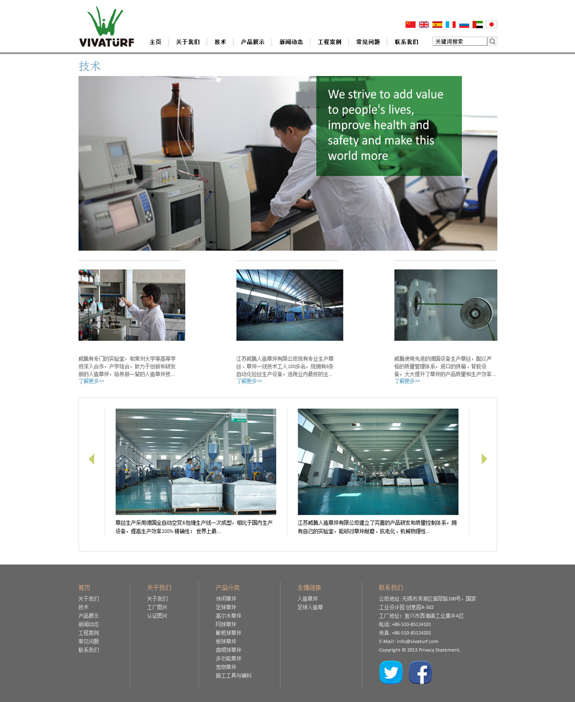 江蘇威騰人造草坪有限公司是由無錫威盛體育設施有限公司和宜興市聯(lián)創(chuàng)塑業(yè)有限公司共同投資創(chuàng)建的集人造草坪草絲,研發(fā),生產(chǎn),銷售,人造草坪研發(fā),生產(chǎn),銷售,安裝及售后服務一體化的綜合性企業(yè)。
